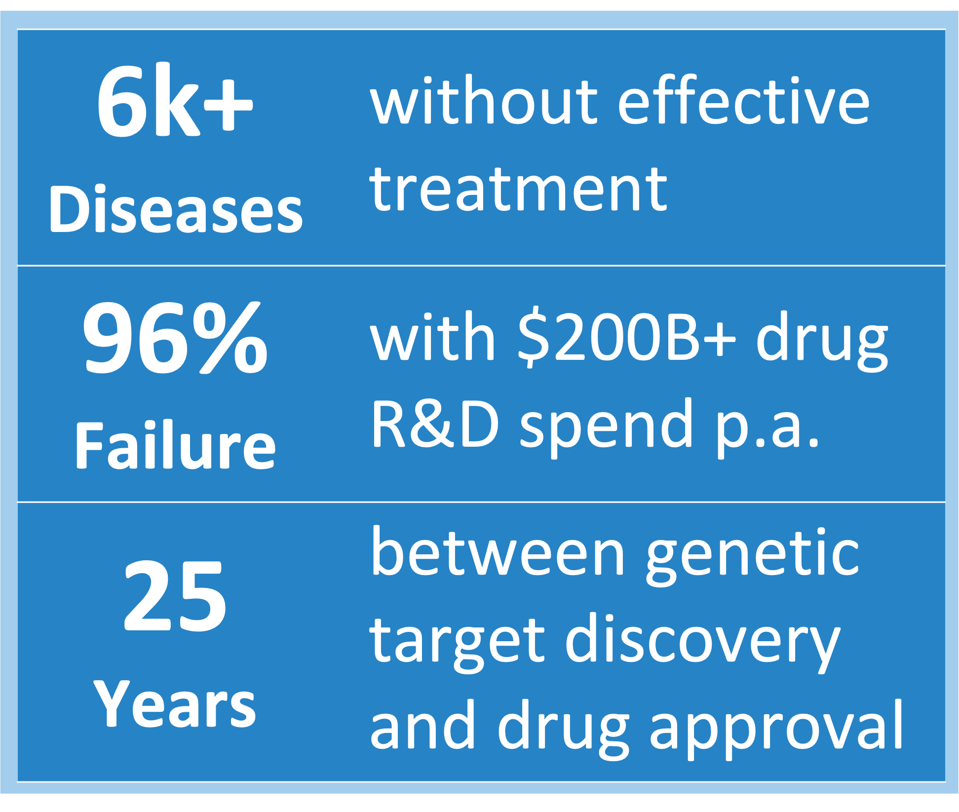 Biopharma wins come from hard-fought battles. There are about 7000+ diseases with known molecular basis but less than a 1000 have FDA approved treatments. Translation of lab findings to approved drugs continues to be highly risky and costly. The key bottleneck is in incomplete understanding of human disease biology.
