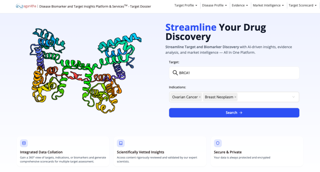 Aganitha DBTIPSTM auto-collates and analyses evidence, market intelligence and target properties to enable comprehensive target and biomarker identification, assessment & validation.